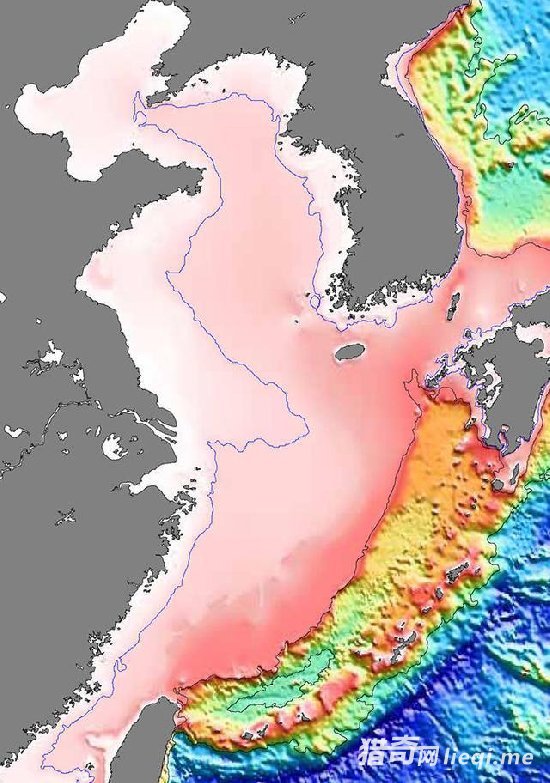 图片为东亚海域的水深示意图,中国周边海区除去南海以来,水下环境非常不利于潜艇进行作战,从图片中我们可以发现从我国海岸,向外海大陆架前推500千米至700千米才能到达水深超过200米的海域,靠近我国黄海、渤海向下到西太平洋西侧我方海域平均水深在50至120米之间,这里潜艇基本上无险可守,