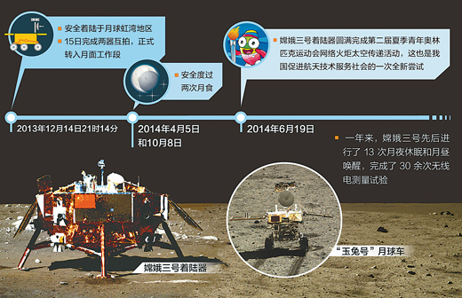 北 京中心嫦娥三号任务长管主任设计师崔雁告诉记者,登陆月面一年中,嫦娥三号先后进行13次月夜休眠和月昼唤醒,成功经受住历次月夜极寒环境的考验;完成了30余次无线电测量试验,地面科技人员通过数据处理分析获取高精度观测量,从而验证了北京中心深空干涉测量系统的性能。此外,2014年6月19日,在北 京中心的精心组织下,嫦娥三号着陆器圆满完成了第二届夏季青年奥林匹克运动会网络火炬太空传递活动,这也是我国促进航天技术服务社会的一次全新尝试。