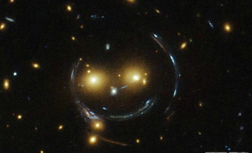圆形脸实际上是由两组引力效应扭曲的46亿光年远的星系的光线。而两个“眼睛”实际上是两个相互以超过300000英里每小时(482803公里/小时)靠近的巨大的星系。科学家预计它们将在十亿年间发生碰撞。