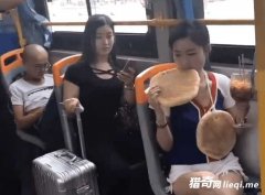 女子公交车上脖子挂大饼,吃着高脚杯泡面