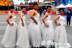 2015年3月14日,湖北武汉,一游乐场举办集体反串求婚活动,6位女子反串新郎跪地求婚,成功牵手身穿婚纱、脚蹬高跟鞋的男友。现场还举办了滚床单等娱乐活动。图为身材婚纱的参加活动男子。分页标题 现场,穿婚纱的反串新娘在吹气球。分页标题 活...