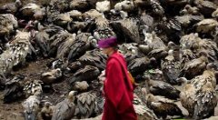 天葬结束后,一名喇嘛在一群秃鹫前方走过。天葬是西藏的一种传统殡葬方式,一直充满神秘色彩。进行天葬时,死者的遗体被剁成肉块,而后喂秃鹫。佛教徒认为把肉体献给秃鹫是一种功德,能够让死者赎回生前罪孽,有利于灵魂转世。 天葬的流程 一只秃鹫在...