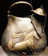 10、鎏金舞马衔杯纹银壶 藏于陕西省历史博物馆,高18.5厘米,扁圆腹,莲瓣纹壶盖,弓形提梁,一条细链连结着壶盖与提梁。壶底与圈足相接处有同心结图案一周,系模仿皮囊上的皮条结。 圈足内墨书十三两半,是壶的重量。壶腹两侧用模具冲压舞马图,马肥臀体健...