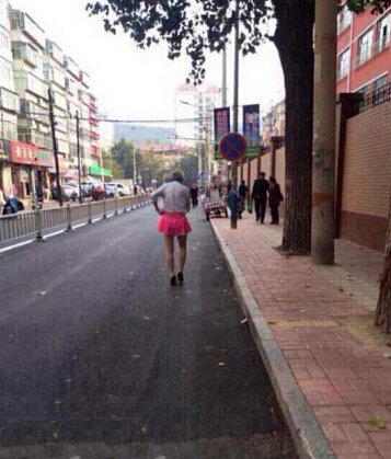 济南街头惊现老大爷穿超短裙高跟鞋