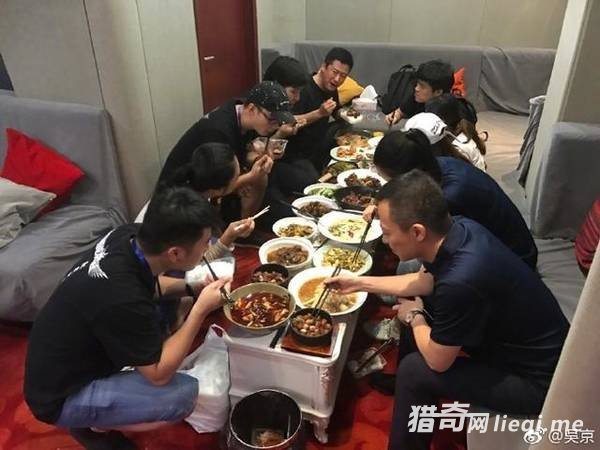 最近吴京在微博中分享了主创人员的工作餐说:“终于吃了顿好的,小伙伴们辛苦啦!”,在这组照片中10个人围在一个小桌子面前享用晚餐,照片中显示空间非常狭小,大多数人都没有沙发坐,就连吴京自己也是半蹲着在吃饭,虽然条件艰苦,不过饭菜看起来还是挺丰富。