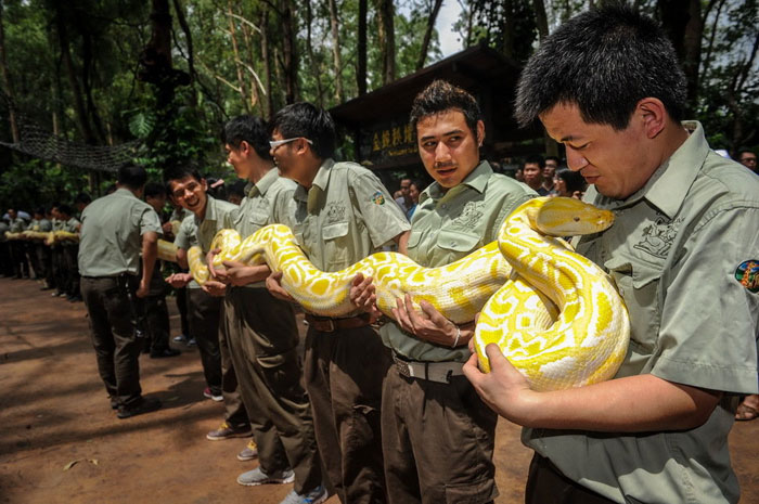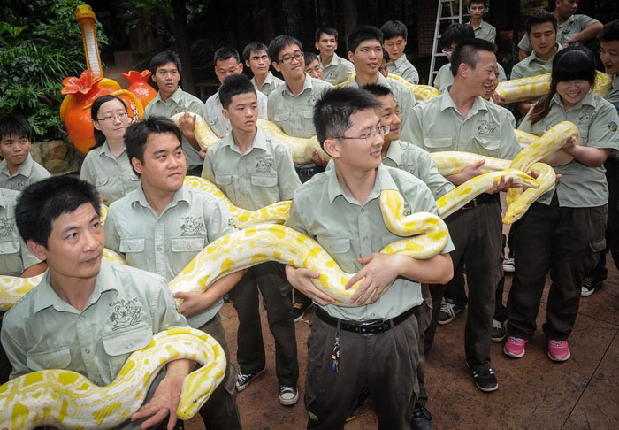 6月23日,广州长隆野生动物世界的饲养员们抱着6条黄金蟒排成“金蟒阵”。当日,包括一条7米长“蛇后”在内的6条黄金蟒入驻广州长隆野生动物世界“金蛇秘境”主题蛇馆,这使长隆的黄金蟒总量超过20条。黄金蟒是缅甸蟒蛇的白化突变种,性情温顺,主要分布在印度、缅甸、斯里兰卡和泰国北部等地区。
