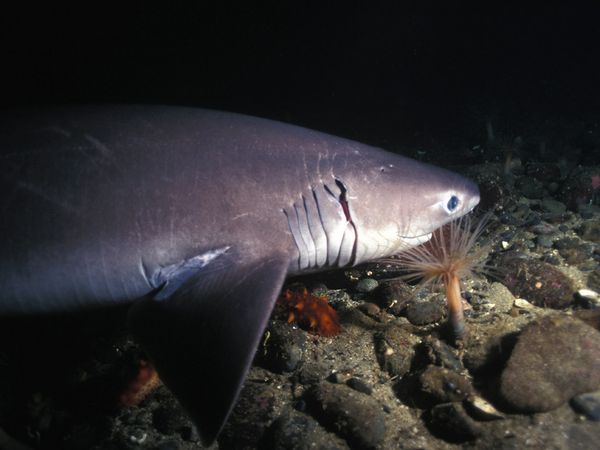 六鳃鲨,例如图中显示的温哥华海岸的这头,白天在海床处巡游,有时候甚至到8200英尺(2500米)深处,然后夜晚浮到水面觅食。它们身长16英尺(4.8米),以其他鲨鱼,鳐鱼,鱿鱼,螃蟹,偶尔海豹为食。