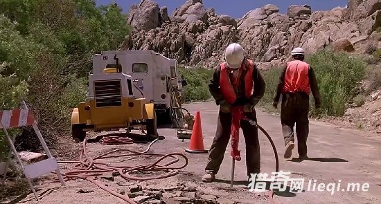 公路修理现场,一群工人正在忙碌着,其中一人正拿着电钻钻公路