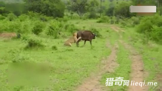 水牛一个转身旋转180度,想把狮子甩下来