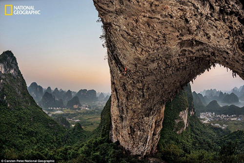 中国南方特有的喀斯特地貌形成的石林形态各异,它那自然壮阔的景观一直是吸引游客纷至沓来的理由。自然是最伟大的艺术家,用她那神之手,创造出无数美丽的地理奇观。图为攀岩高手艾米莉-哈林顿正在攀爬月亮山。