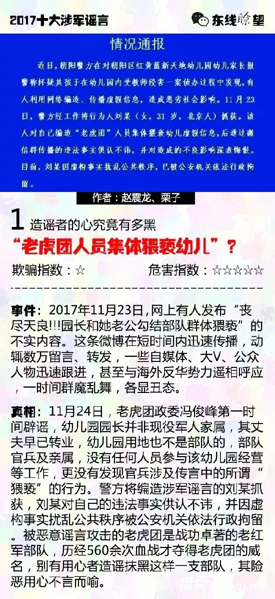 然而,敌人无法在真实的战场上打败我们,就试图在没有硝烟的网络战场攻城略地。黑白颠倒,肆意抹黑,无中生有,一条条用心无比邪恶的涉军谣言,化身射向战士背后的罪恶子弹,让人民军队一次又一次无辜躺枪。今天,我们就一同盘点2017十大涉军谣言,曝光别有用心者的丑恶嘴脸!