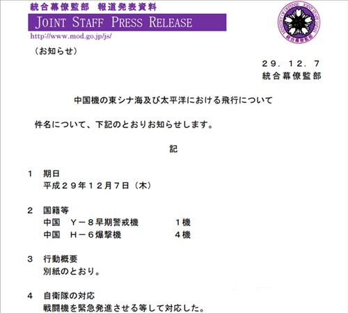 图为日本统合幕僚监部12月7日发布的公告