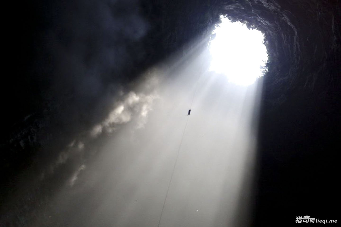 天下之大无奇不有,这不地球上有很多巨坑,有的是天然的,有的却是人为的。在自然条件下,较大规模的深坑则被称为天坑。墨西哥有名的“燕子洞”,深度达426米,照片中我们可以看到一名探险者正从洞口空降进去。