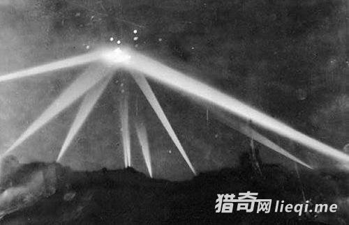 1942年2月25日,探照灯的灯光都集中在美国洛杉矶上空的一个不明飞行物上。那个明亮物体周围的亮斑,是防空炮弹爆炸産生的碎片。