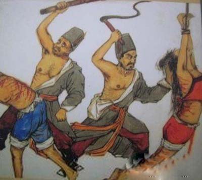 砧板拖:中间放一块铁板,上面有密密麻麻的突起的小铁块,一般比较锋利,是铸造时铸的。犯人要赤身裸体,两匹马拉着犯人在上面来回拖拽。