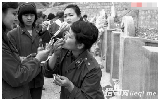 1987年清明节,云南麻栗坡烈士陵园内,139师几个女兵正点燃香烟,祭奠战友。