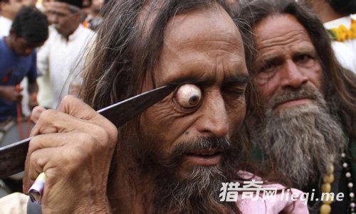 印度阿杰米尔,一名男子在宗教游行上用剑指着自己的眼球,纪念苏菲派圣人Qudri Rafai Junoon Ali Sai去世。