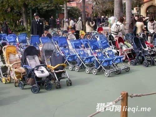 日本节日公园的门外。婴儿车摆放得井井有条 。