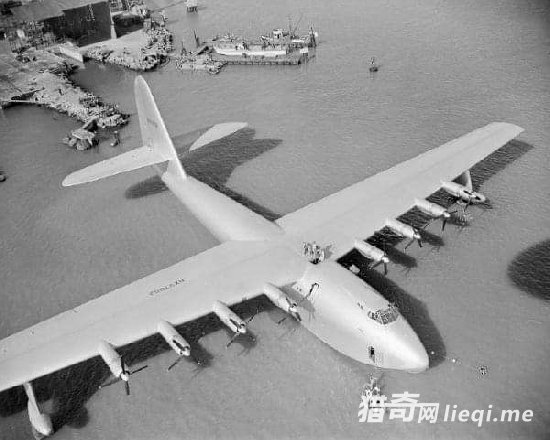 7、H-4“大力神” 这是一架巨大的飞机,上单翼,八发,木结构,翼展比747还大。它只在港湾里蜻蜓点水地飞过一次,就进了机库,再也没出来过。