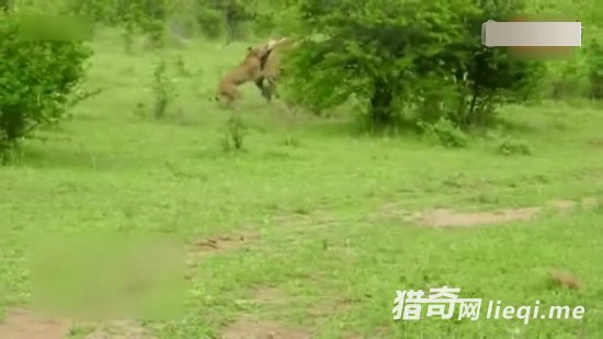 狮子猛的扑了上去!瞬间咬住了水牛臀部!这是一招“弱点击破”!对于水牛而言,臀部和背部是其无法防御的盲点,这里受到攻击,就直接意味着战争的胜利天平已经不再向自己倾泻。