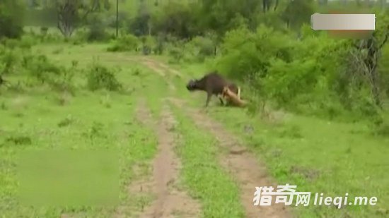 水牛一个转身旋转180度,想把狮子甩下来
