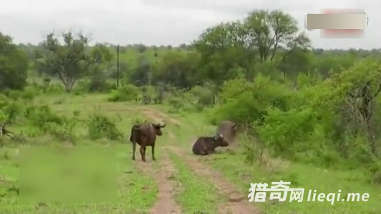 老水牛掉头,尖角又冲着刚刚掉落的狮子