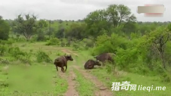 老水牛掉头,尖角又冲着刚刚掉落的狮子,旁边的水牛想过去帮忙。